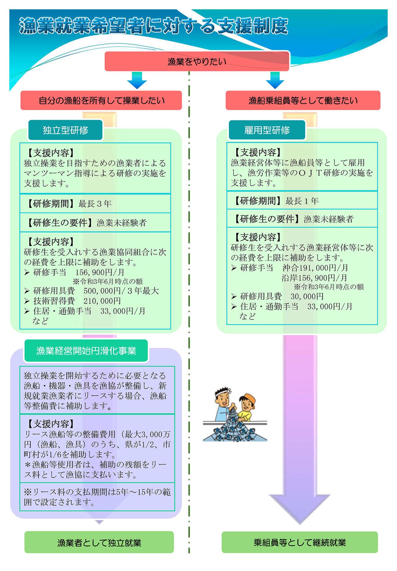 | 【支援内容】 | 研修生への研修手当、研修用具費、住居・通勤手当、船舶無線免許取得費等 |