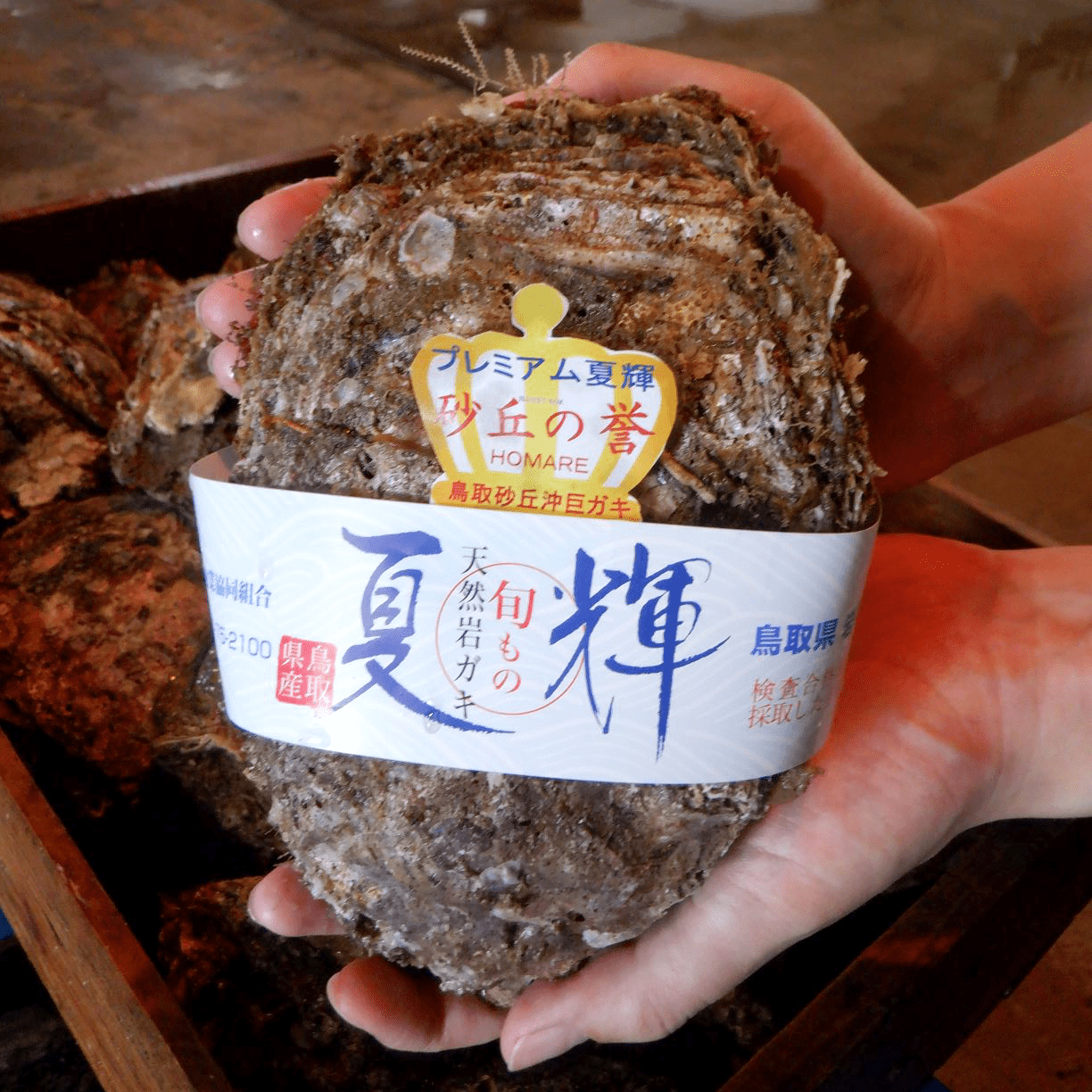 岩ガキ”夏輝”トップブランド登場! | 鳥取県のブランド岩ガキ「夏輝」。その中でも特に巨大な“プレミアム夏輝”、その名も【砂丘の誉(ほまれ)】が新登場! 鳥取砂丘沖の水深20m付近の深場に眠る巨大岩ガキは殻長13cm以上の夏輝につけられる通常のラベルが届かない程の大きさで、市場への供給量は1日10~30個程度とまさにプレミアムな岩ガキです。そんな【砂丘の誉】には、トップブランドの証として王冠型のラベルが取り付けられます。 |